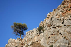 Le soleil se lève, pour la première fois, à travers les nuages. Après le petit-déjeuner, nous entamons la descente. Nous suivons une ancienne canalisation d’eau et cheminons à travers des gorges abruptes. Plus bas, nous nous arrêtons pour admirer un olivier vieux de 2200 ans, le plus vieux de Grèce.