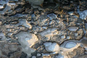 Nous découvrons notre site de bivouac au lever du soleil. Les cavités dans les rochers sont emplies de sel que les habitants viennent récolter. La matinée est libre, nous nous baignons et nous enduisons de l’argile présente en bord de mer.