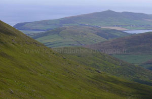 On revient à Dingle et on passe le Connor pass (le col le plus haut d'Irlande, 457m), de là haut 2 superbes vues s'ouvrent sur la rade de Dingle d'un côté et sur la baie de Brandon de l'autre côté, on voit les 2 côtes de la péninsule,
