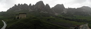 Une fois le groupe reconstitué, nous descendons, au milieu des aiguilles du Cir, vers le refuge, plus le but approche plus nous accélérons, l'orage menace. Derrière le refuge à Passo Gardena, nous apercevons l'étape du lendemain, le massif de Sella. Nous nous installons dans le refuge, lorsque l'orage gronde, la pluie donne une lumière toute particulière au massif que nous avons descendu en fin de journée. Après cette longue étape, la soirée est courte et la nuit longue.