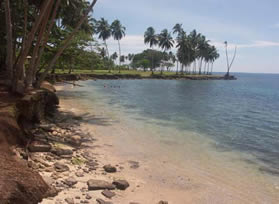 Le départ est délirant ; la foule des villageois nous adresse de grands signes depuis le village et la falaise. Nous traversons un banc de thons qui jaillissent hors de l'eau. L'accueil à Potsdam est plus calme ; pendant que nous profitons de notre dernière baignade dans le Pacifique, Franck organise notre retour sur Madang - vive le téléphone satellite ! En début d'après-midi, le minibus qui nous avait amenés ici nous reconduit à Madang, où nous sommes les seuls clients d'un complexe hôtelier qui fut luxueux, mais aurait besoin d'une restauration.