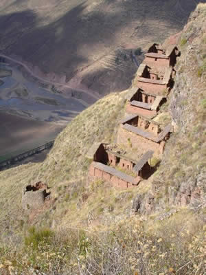 Nous montons, le site nous appartient car nous sommes presque seuls. De plus les quelques rares touristes que nous croisons, font donc le parcours en sens inverse du notre… Le chemin n’est pas facile, très abrupt parfois : Les terrasses qui surplombent la vallée, le village, la tour de guet qui domine Pisac. Mais comment faisaient-ils ?
