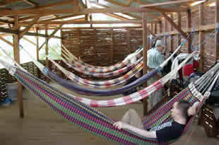 Saül est le seul vrai village Guyanais situé au coeur de la forêt amazonienne, il a été fondé à l'époque de la ruée vers l'or et comporte une centaine d'habitants. On y trouve une mairie, une église, un dispensaire et même une poste. L'électricité est fournie par des capteurs solaires complétés au besoin par un groupe électrogène. Nous recevons les hamacs dans lesquels nous dormirons pour les 10 prochaines nuits et les installons sous le carbet.