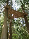 lateforme. L'échelle est faite de larges barreaux de bois, tenue par des câbles, tremblante autant que moi. Bien mettre son corps au centre des barreaux et non sur les côtés, car l'échelle tournerait alors sur elle-même; accrocher ses deux manilles de survie et en avant.Notre moniteur, Mathieu, nous fait une petite démonstration. Pas facile de mettre les crochets en place lorsqu'on est trop petit, d'ailleurs, l'exercice est interdit aux enfants. Il l'est aussi, et ça se comprend, aux femmes enceintes et aux personnes en état d'ébriété….